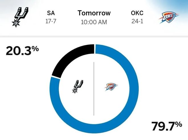 特别值得一提的是,本场比赛开打前,雷霆胜率预测高达79.7%,而马刺只有20.3%,然而文班亚马的回归,彻底改变了这一切。